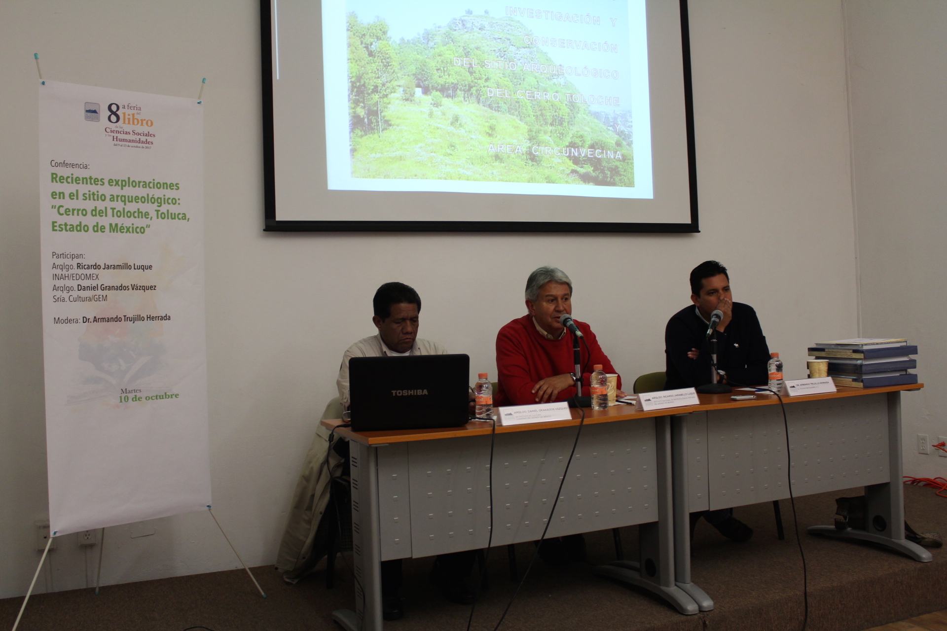 En un salto temático, los arqueólogos Ricardo Jaramillo Luque, delegado estatal del INAH, y Daniel Granados Vázquez, de la Secretaría de Cultura estatal, expusieron la información sobre los resultados de las exploraciones en el sitio arqueológico del Cerro del Toloche, que iniciaron hace seis años, aunque había informes previos de José García Payón, Román Piña Chan y Yoko Sugiura, y el proyecto de exploración se presentó entre 1998 y 1999, sin que recibiera el apoyo de las autoridades municipales de esos años.